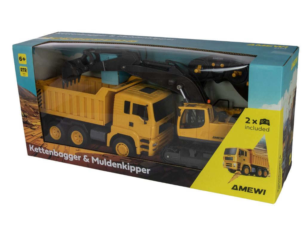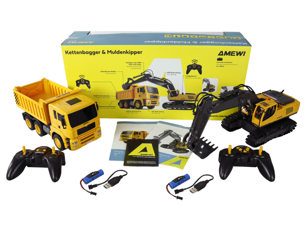 Amewi RC 2v1 set Kiper & Bager 1:18 RTR – Ta obsežen komplet RC gradbenih strojev vključuje daljinsko voden bager na gosenicah in prekucnik, kar zagotavlja dvojni gradbeniški užitek za otroke od 6. leta starosti naprej. Oba modela sta dobavljena kot RTR komplet (Ready-to-Run) – priložena sta dva daljinska upravljalnika, dva akumulatorja in dva USB polnilna kabla, zato je igra lahko takoj pripravljena. Odlična izbira za skupno igro s prijatelji ali sorojenci.