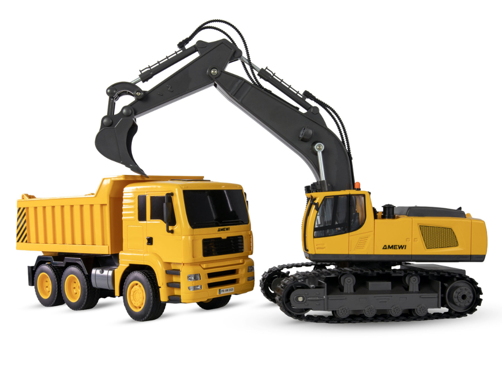 Komplet RC gradbenih strojev v merilu 1:18 vključuje daljinsko voden bager z jekleno žlico in prekucnik z dvižno kesono. Oba vozila imata LED osvetlitev, 2,4 GHz sistem in čas vožnje do 20 minut. Odlična izbira za male gradbenike in skupno igro.