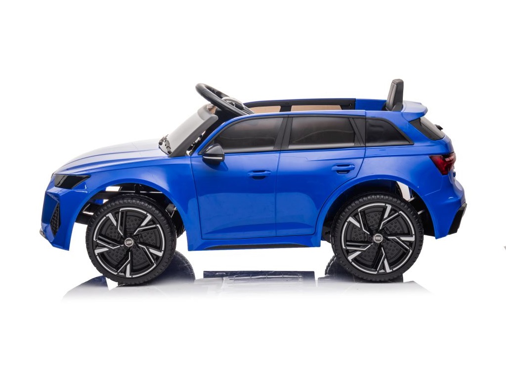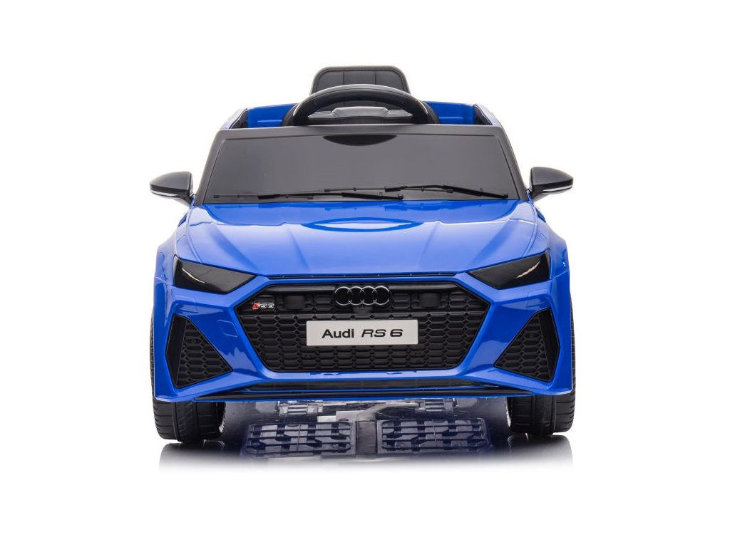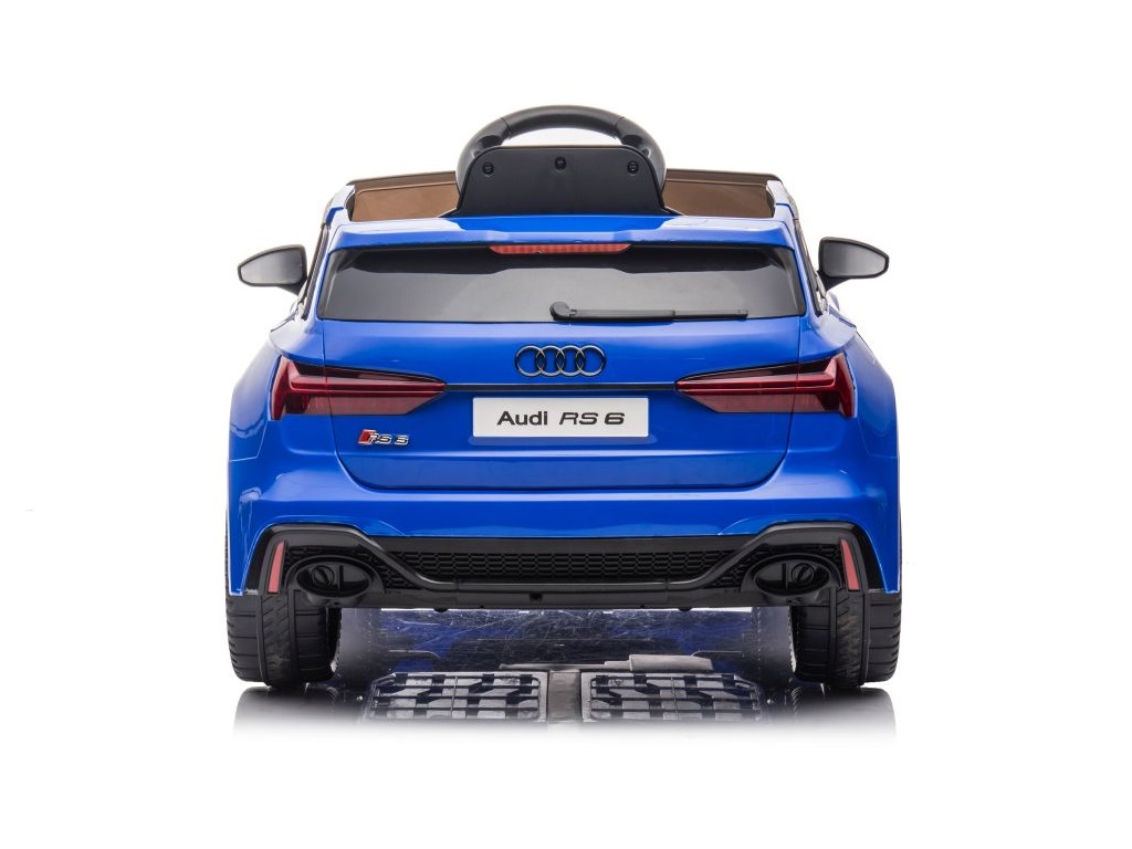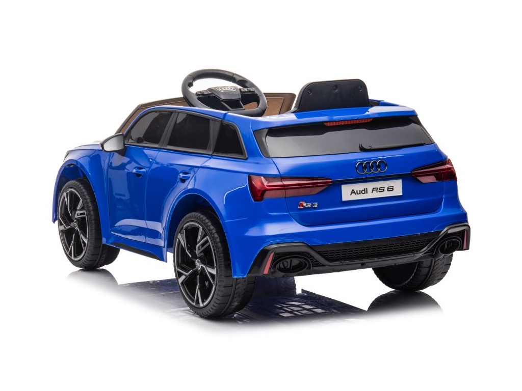Avto na akumulator Audi RS6 moder ima realističen videz, izvirnih značilnosti, izdelane podrobnosti in logotip na pokrovu motorja, volana, kakovosti materialov in izdelave ter širok plastični sedež. Avto je opremljen tudi z LED lučmi. 2 gumba za sodobno glasbo in pesmi, priključek za MP3 ter USB. Posebna prednost tega vozila pa je v tem, da ima na sprednjem delu ročico, ki vam pomaga pri prevažanju vozila, ko mu zmanjka baterije.