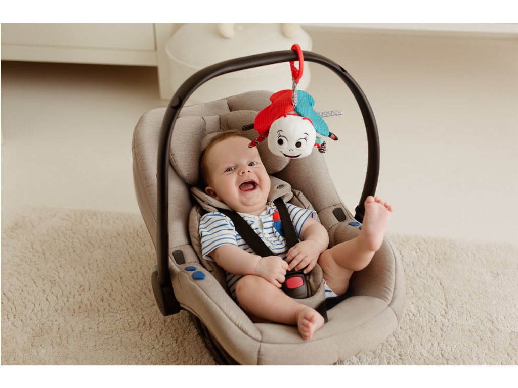 Praktična zaponka omogoča enostavno pritrditev na posteljico, voziček ali avtosedež, zato čebelica vedno spremlja otroka, doma ali na poti.