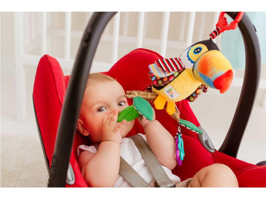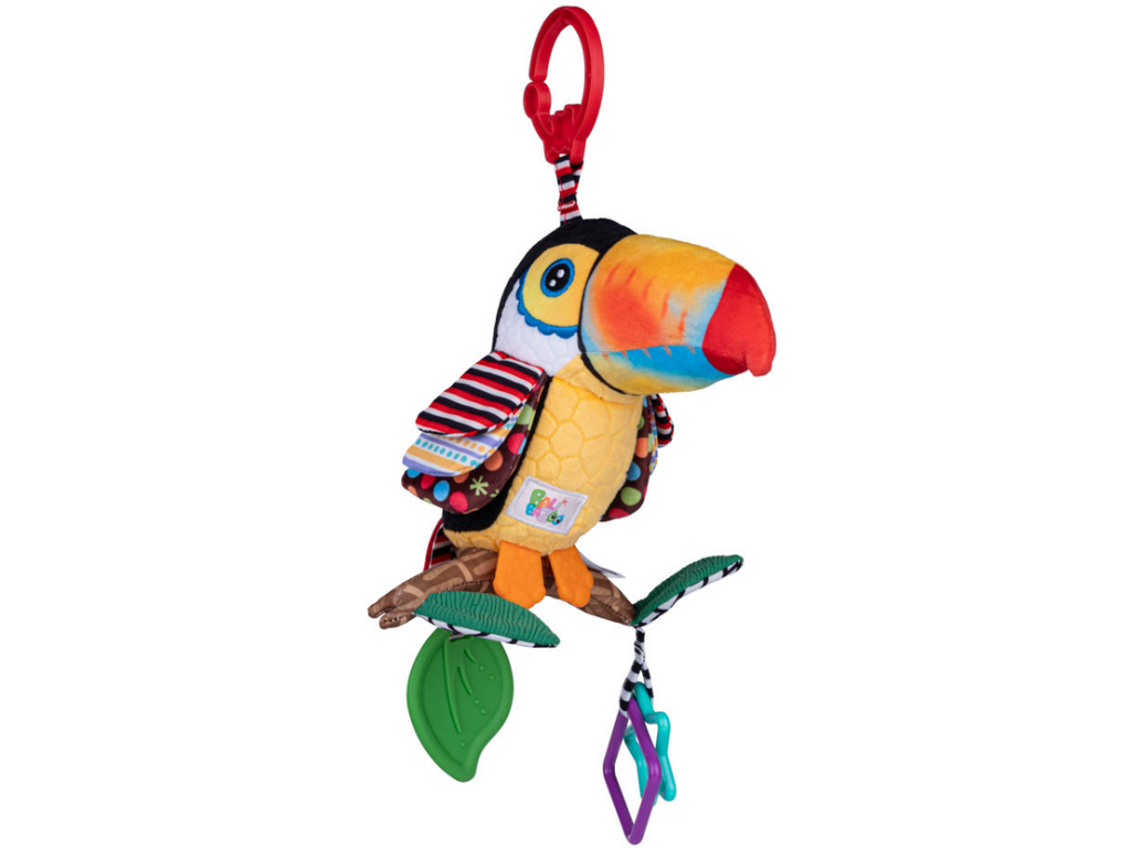 Igrača vsebuje številne interaktivne elemente, kot so šumeča krila in listi, materialne etikete ter vgrajen zvonček, ki ob tresenju oddaja prijeten zvok. Tukan ima tudi več grizal – mehka in trša – ki pomagajo lajšati nelagodje ob izraščanju zob. Zahvaljujoč praktični zaponki ga lahko enostavno pritrdite na voziček, posteljico ali avtosedež.