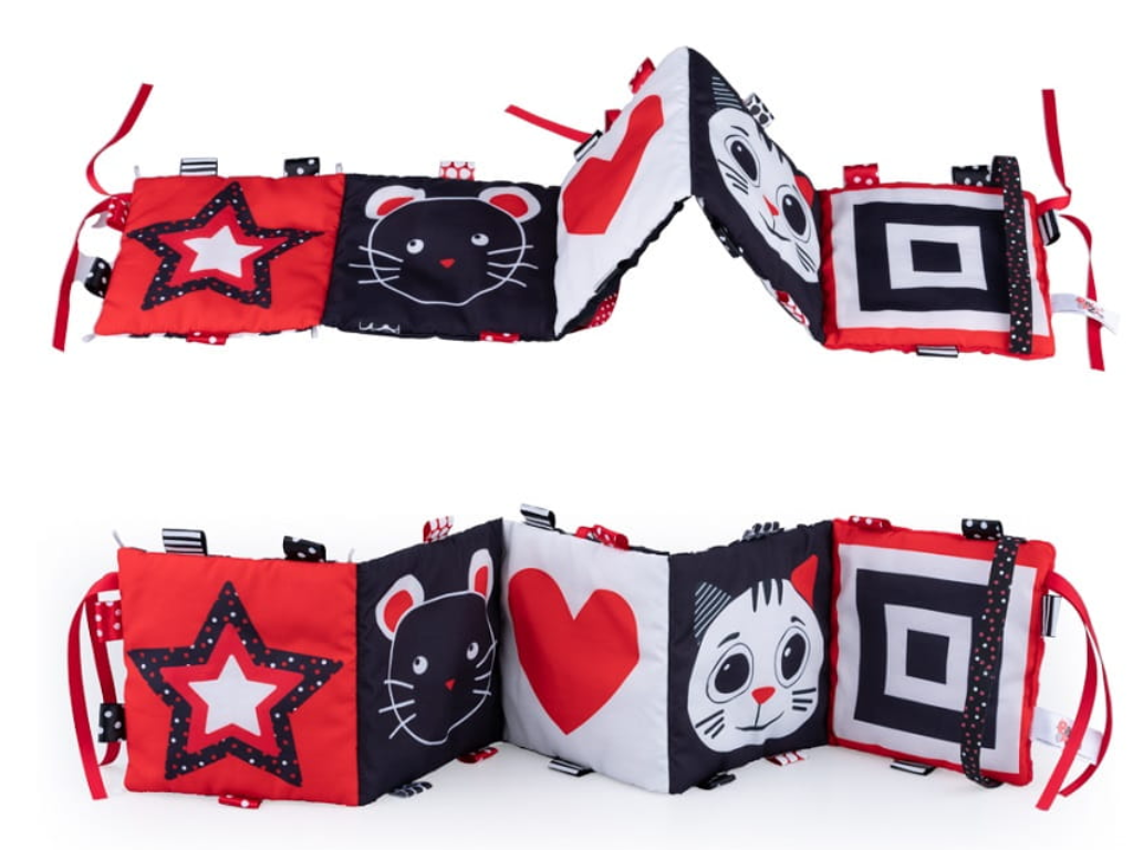 Knjigica je zasnovana v obliki harmonike, kar omogoča, da jo popolnoma razprete in postavite na ravno površino ali ob rob posteljice. Tako otrok lahko opazuje slike tudi med ležanjem na trebuščku. Materialni trakovi in všite etikete dodatno spodbujajo raziskovanje in igranje. Priložene vezice omogočajo enostavno pritrditev na posteljico, voziček ali drugo primerno mesto.