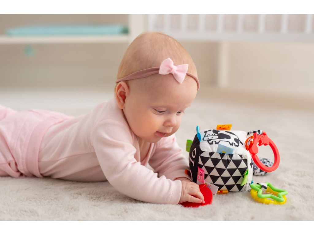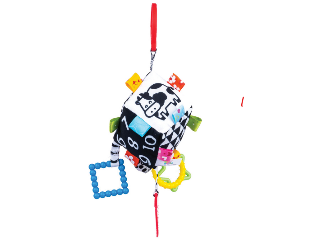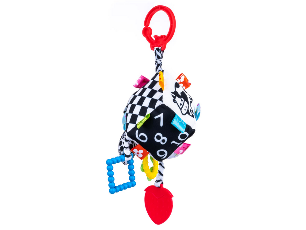 Kocka je opremljena z barvitimi trakovi različnih struktur, ki spodbujajo tip in fino motoriko. Dodani grizali pomagajo lajšati nelagodje ob izraščanju zob, kar igračo naredi še bolj uporabno v zgodnjem obdobju razvoja. Zahvaljujoč praktični zaponki jo lahko enostavno pritrdite na voziček, posteljico ali avtosedež, zato je vedno pri roki.