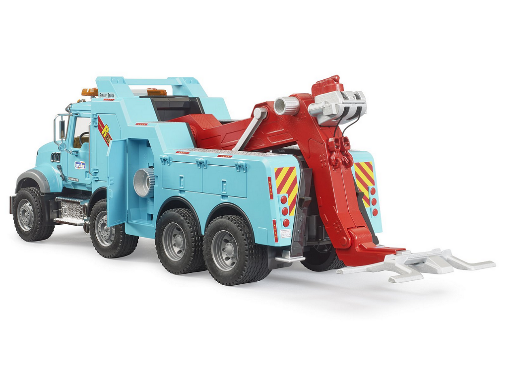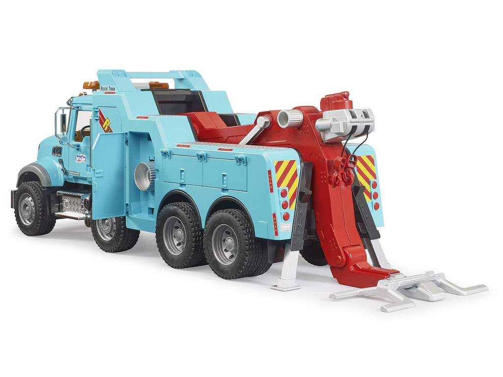 Bruder Mack Granite tovornjak za reševanje in vleko 02831 – Novo reševalno in vlečno vozilo Mack Granite. Dvigalo je mogoče zložiti in vanj namestiti sprednja kolesa vozila, ki ga je treba vleči. Za eno od številnih odpiralnih loput se nahaja nastavitev višine glavne roke, s katero je mogoče dvigniti glavno roko, vključno z vozilom. Na koncu teleskopske roke je nameščen kabelski vitel. Priloženi adapter je mogoče pritrditi na odbijač vozil MAN TGS, MB Arocs, MACK, SCANIA, ki jih je treba izvleči, vozilo, ki je bilo udeleženo v nesreči, pa je mogoče izvleči in odvleči na kolesno dvigalo s pomočjo kabelskega vitla.