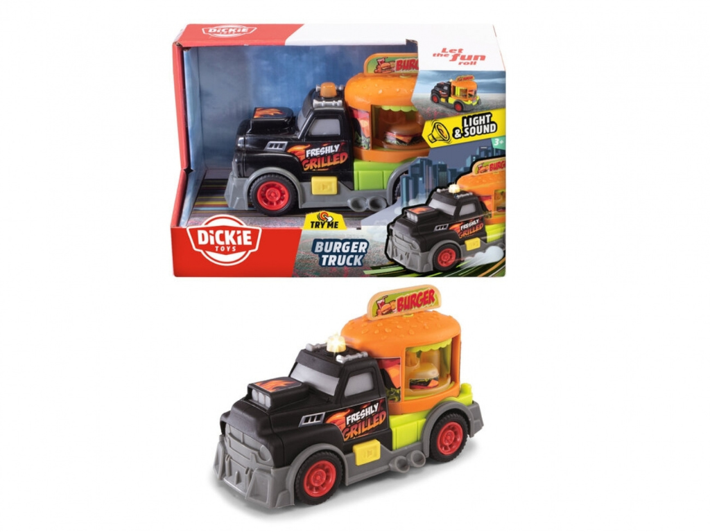 Dickie Burger truck 15 cm Pripravite se na gurmansko zabavo s tovornjakom z burgerji! To 15 cm dolgo dostavno vozilo je namenjeno otrokom od 3. leta naprej in združuje igranje z realističnimi funkcijami, ki vsakemu malčku pričarajo občutek prave mobilne burger kuhinje.