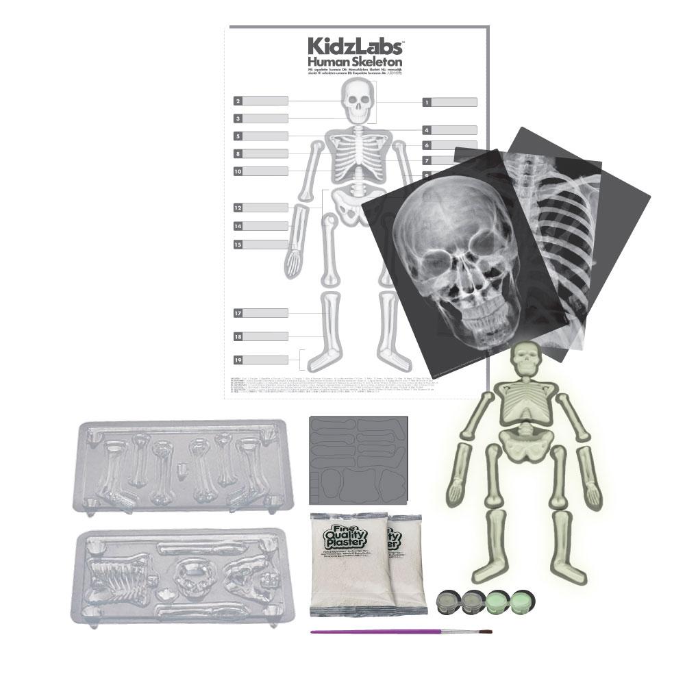Vsebina: 1: pladenj s kalupi za skelet x 2, 2: rentgenski posnetek x 3, 3: slika skeleta, 4: gips v prahu x 2, 5: čopič, 6: svetleča in siva barva, 7: samolepilni magneti v obliki kosti, podrobna navodila.