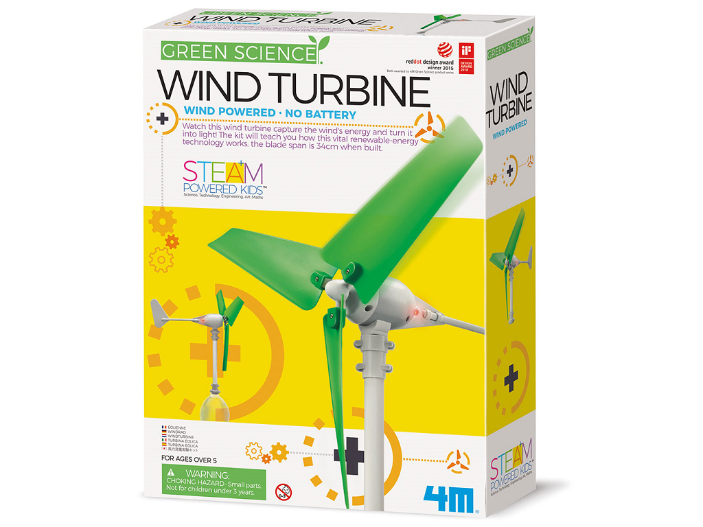 Didaktične igrače 4M Vetrna turbina – Opazujte, kako vetrna turbina zajema energijo vetra in jo pretvarja v svetlobo. Spoznali boste tehnologijo za izkoriščanje tega življenjsko pomembnega obnovljivega vira energije.
