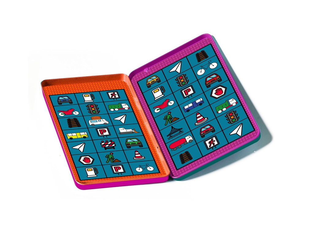 Družabna igra Potovalni bingo je magnetna različica klasične igre Bingo namenjena za 2 igralca. Igralci med potjo gledajo skozi okno in iščejo predmete, prikazane na njihovi igralni plošči. Ko igralec zagleda določen predmet, to glasno pove in sliko predmeta na svoji plošči pokrije z magnetom. Idealno za potovanje: zabavna otroška igra, kadarkoli potujete v avtomobilu!