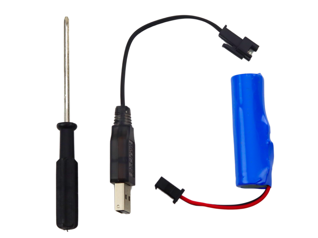 Vse, kar potrebujete za začetek igre, je že vključeno – 3,7 V Li-ionska baterija, USB kabel za polnjenje in izvijač za hitro namestitev. Napolnite z vodo, priklopite baterijo in akcija se lahko začne!