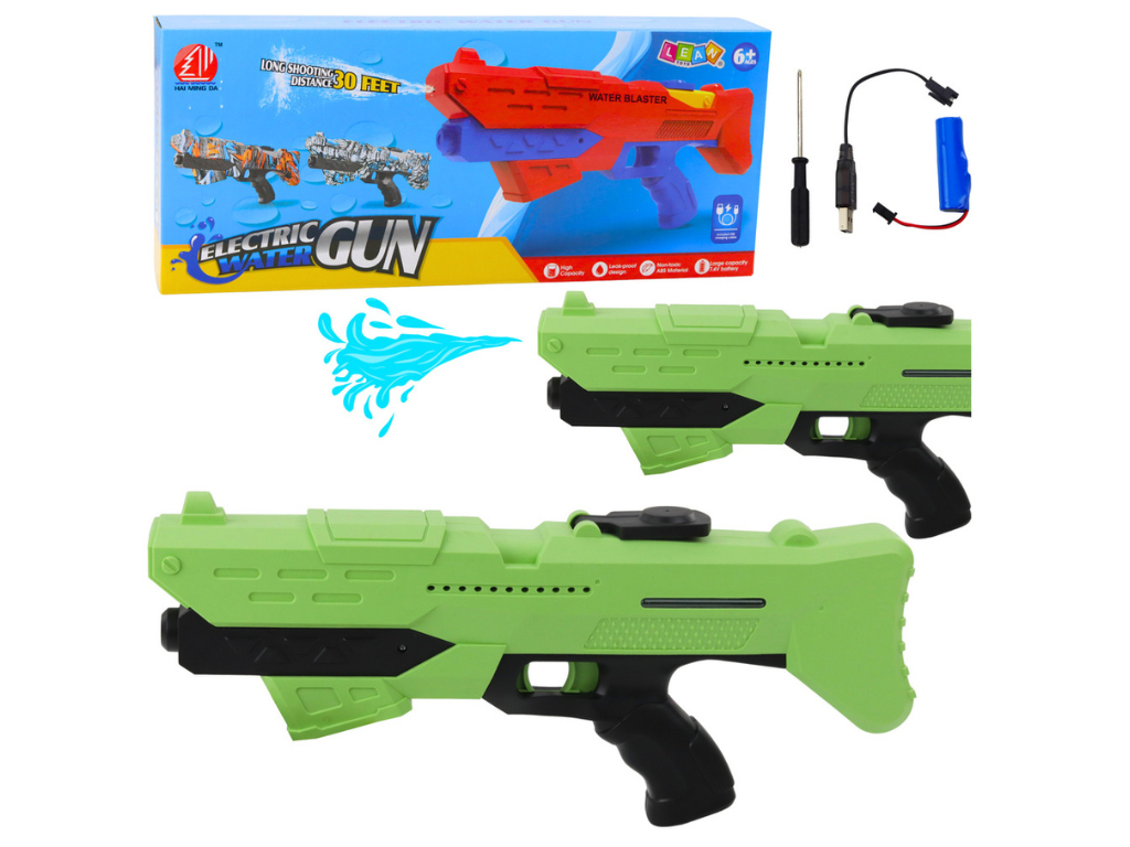 Električna vodna pištola v zeleni barvi omogoča avtomatske vodne strele brez črpanja, z dosegom do 10 m. Komplet vključuje baterijo, USB kabel in orodje – vse za takojšnjo poletno zabavo od 6. leta naprej!