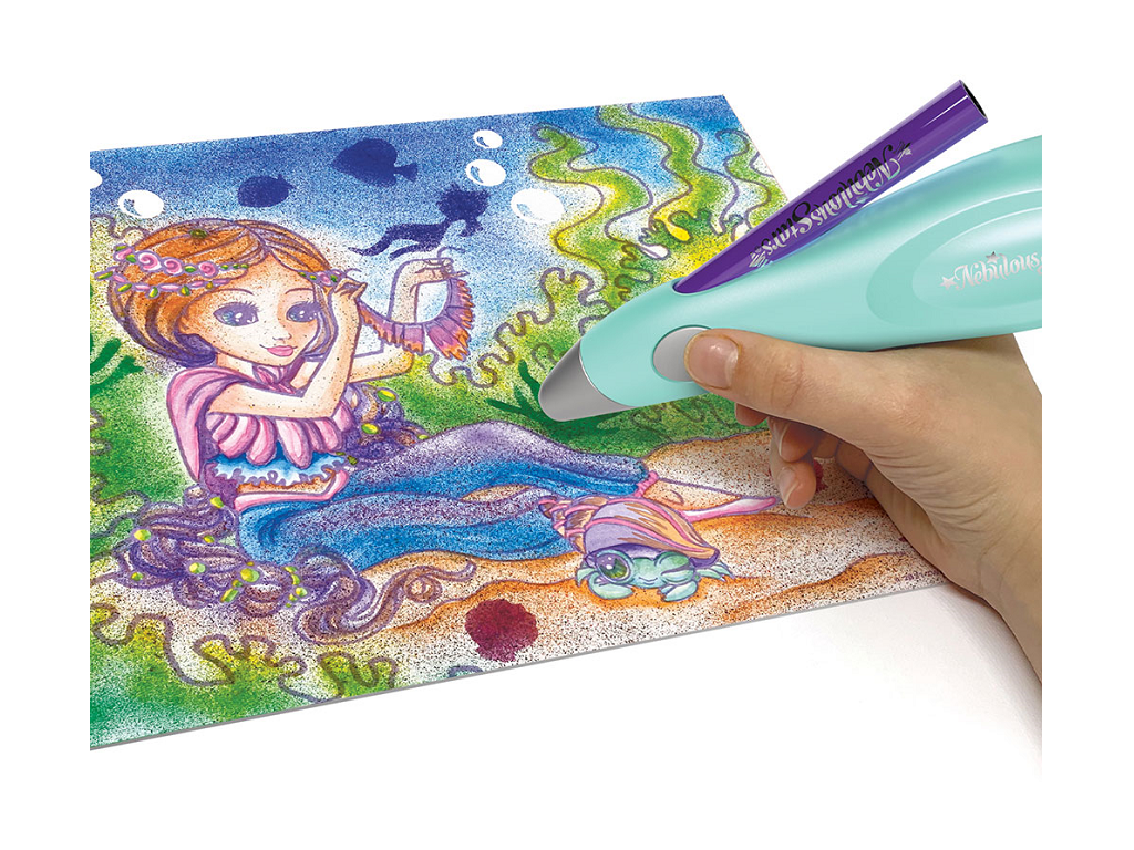 Električno razpršilno pero – kreativni set – Barvajte kot profesionalci! Izberite barvo, vstavite flomaster v električno pisalo in nežno škropite barvo na risbe. Vsebuje tudi šablone, vodene barve in maskirne nalepke.