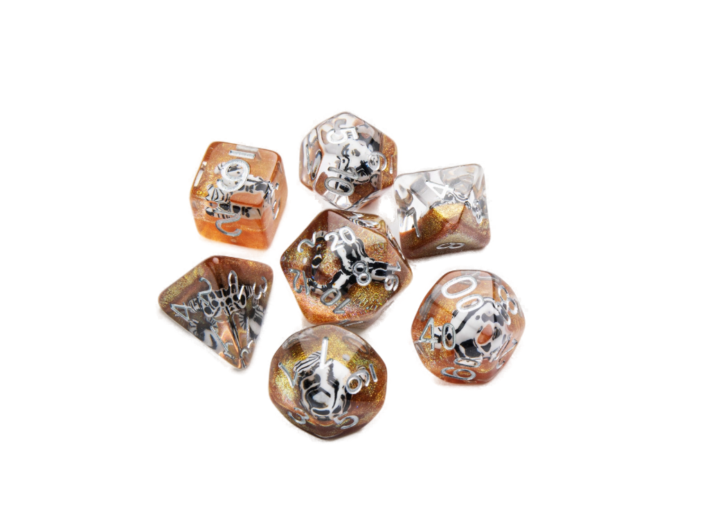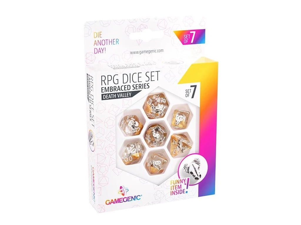 Gamegenic RPG set kock Death Valley – Izberite svoje orožje! Ta komplet kock vsebuje D4, D6, D8, dve D10 (10 in 00), D12 in D20. Vse kocke imajo zaobljene robove in so izdelane na vrhunski ravni. Serija Embraced ima v kocki zanimiv predmet in bodo poskrbele, da bo vaš igralni večer nepozaben. Pakirane so v kartonsko škatlo z okencem, ki na sprednji strani prikazuje vse kocke.