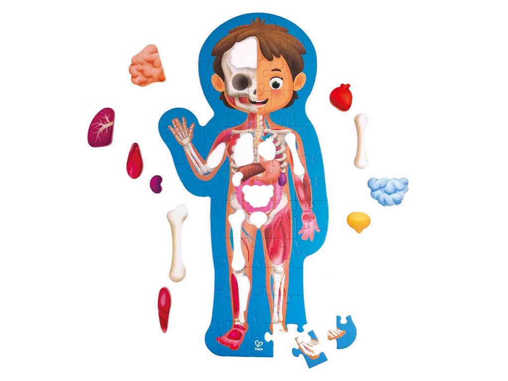 Anatomska sestavljanka iz 50 delov, opremljena s tridimenzionalnimi organi, ki jih lahko dodate na vrh, tako da lahko otroci spoznavajo človeško telo. Priložen je velik dvostranski plakat, s katerim se otroci lahko učijo o sestavi človeškega telesa in to kar v 11. jezikih. Najprej je mogoče sestaviti telo, nato pa postaviti kosti, mišice in organe na prava mesta. Sestavljanje spodbuja koordinacijo rok in oči ter fine motorične sposobnosti. Primerno za starost od 2-4 let.
