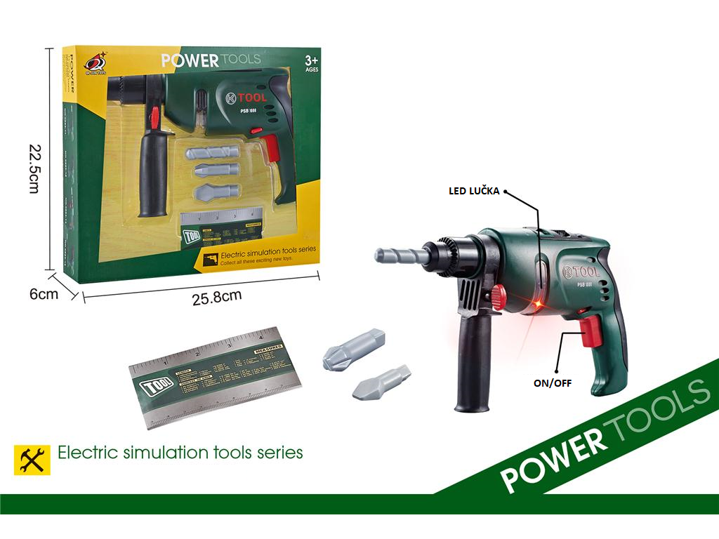 Igranje s predstavljenim kompletom bo pozitivno vplivalo na otrokov razvoj – njegovo bistroumnost, logično razmišljanje, ustvarjalnost in ročne spretnosti. Večnamenski komplet orodja je izdelan iz plastike, ki je odgovorna za nizko težo posameznih elementov. Zasnova igrače se nanaša na pravo orodje. Velika prednost igrač je dejstvo, da so njihove dimenzije prilagojene otroškim rokam, kar jim bistveno olajša uporabo. Razvija koordinacijo rok in oči pri otrocih in spretnost. Vrtalnik oddaja zvoke kot pravi, spreminjate lahko smer vrtenja svedra iz vijačenja v odvijanje.