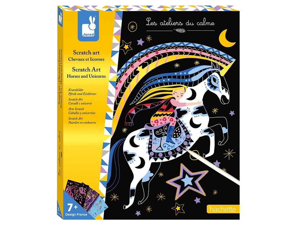Janod Praskanka – Konji in samorogi – S tem ustvarjalnim kompletom bo vaš otrok lahko izdelal čudovite slike in z njimi okrasil svojo sobo. Preprosto popraskajte vnaprej narisane slike, da se bodo pojavili konji in samorogi!
