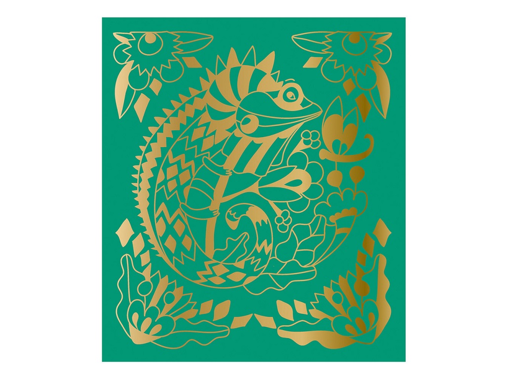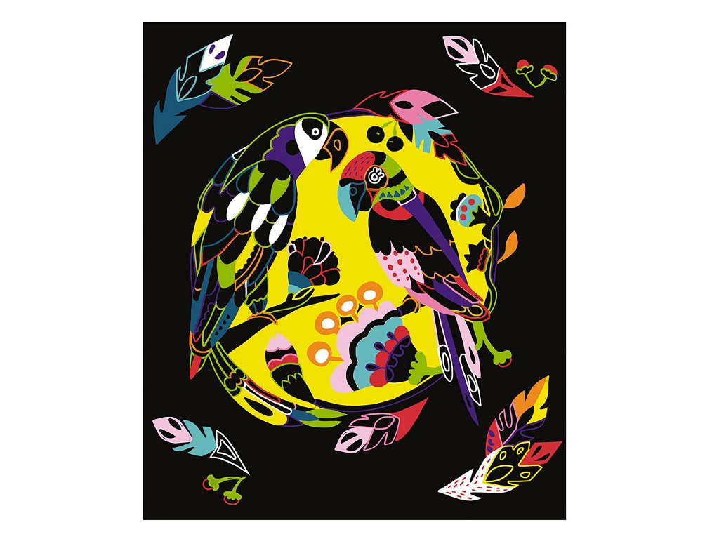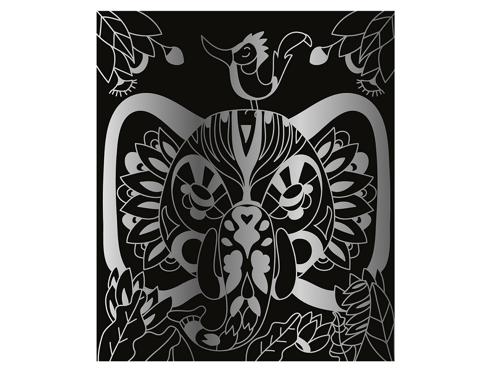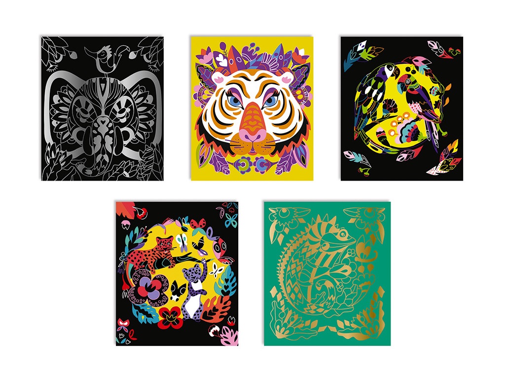 Set vsebuje: 5 slik za praskanje (3 črne, 1 zelena, 1 vijolična) z barvnimi ali pozlačenimi učinki, 1 leseno pisalo in 1 knjižico z modeli in navodili.