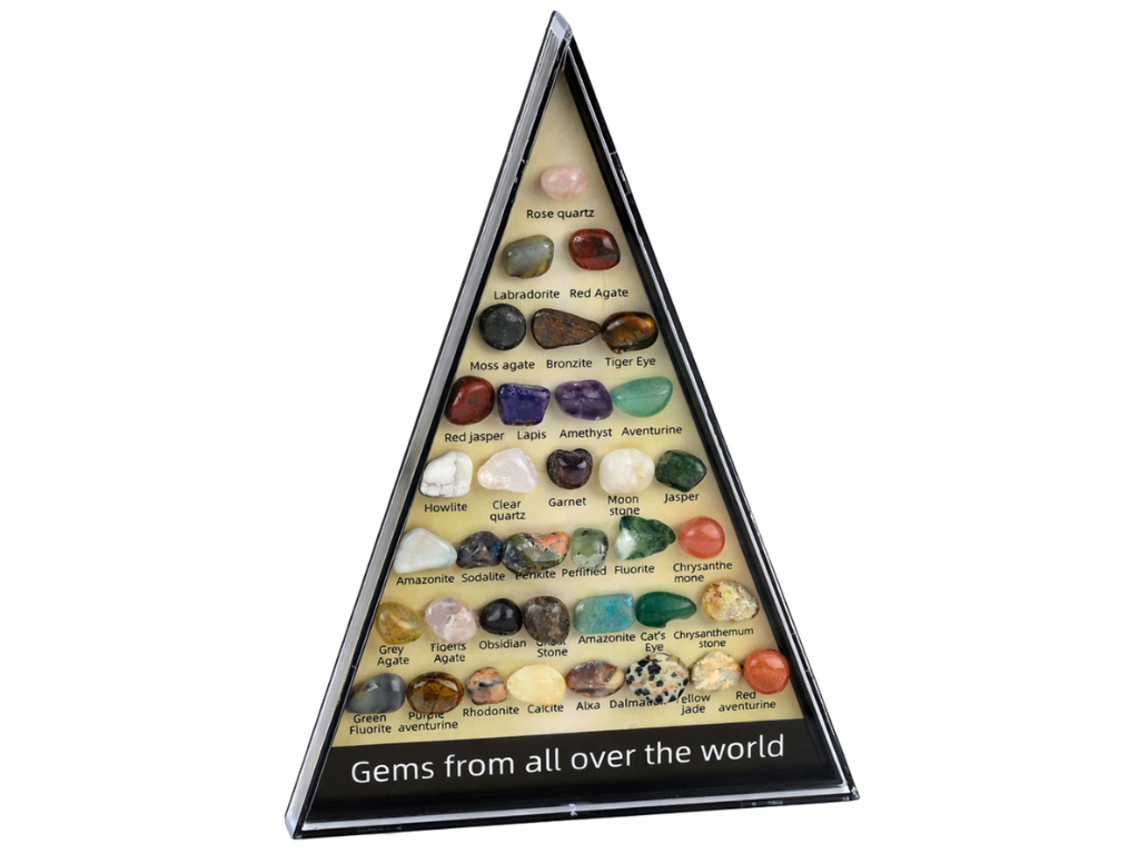 Set vsebuje 36 različnih naravnih mineralov, ki se med seboj razlikujejo po barvah, strukturi in lastnostih. Med njimi najdemo priljubljene kamne, kot so roževec, ahat, tigrovo oko, lapis lazuli, ametist in obsidian. Vsak kamen je označen z imenom, kar omogoča enostavno prepoznavanje in učenje.