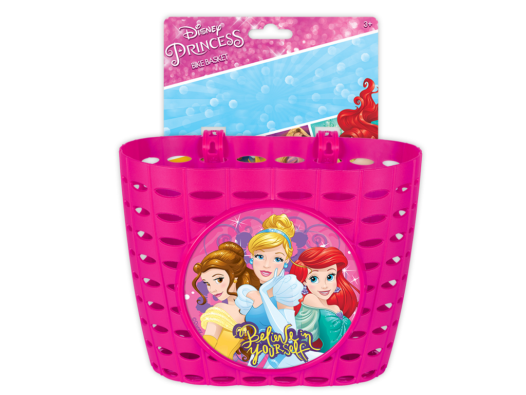 Košara za kolo Princess je zasnovana je za namestitev na krmilo, izdelana je iz barvitega PVC in okrašena z Disneyjevimi liki. Enostavno se pritrdi na krmilo s trakovi, ki so vključeni v komplet.