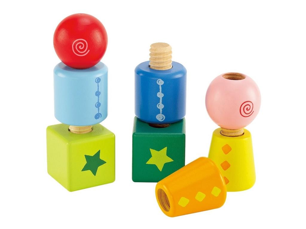 Kocke se z vrtenjem privijajo na lesene vijake. Spodbujanje motoričnih spretnosti s koordinacijo rok in oči. Izdelek krepi logiko, usklajevanje prostorskih razmerij, kritično razmišljanje in razumevanje vzroka in posledice.