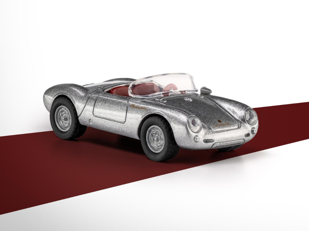 Ta 1:64 merilo modela je natančno izdelan s kovinskim podvozjem, gumijastimi kolesi, vstavljenimi žarometi in ogledalom. Srebrna barva karoserije, rdeč notranji del in nizka aerodinamična oblika odražajo pristno dirkaško podobo legendarnega Porsche 550 Spyder iz leta 1955, avtomobila, ki je takrat navduševal na dirkališčih.