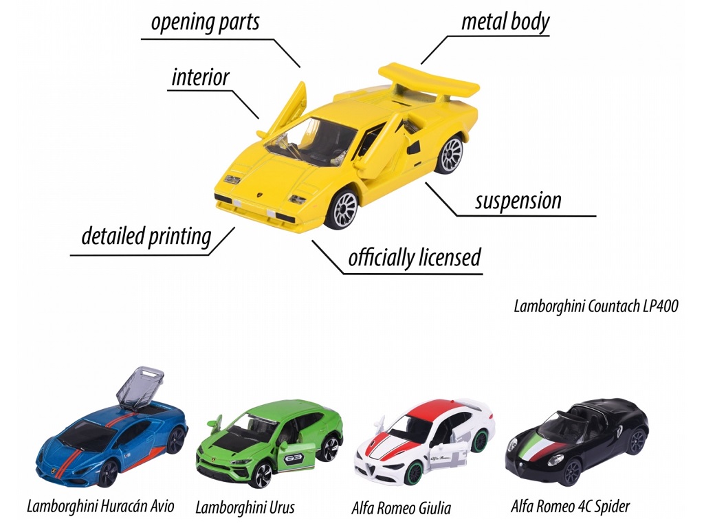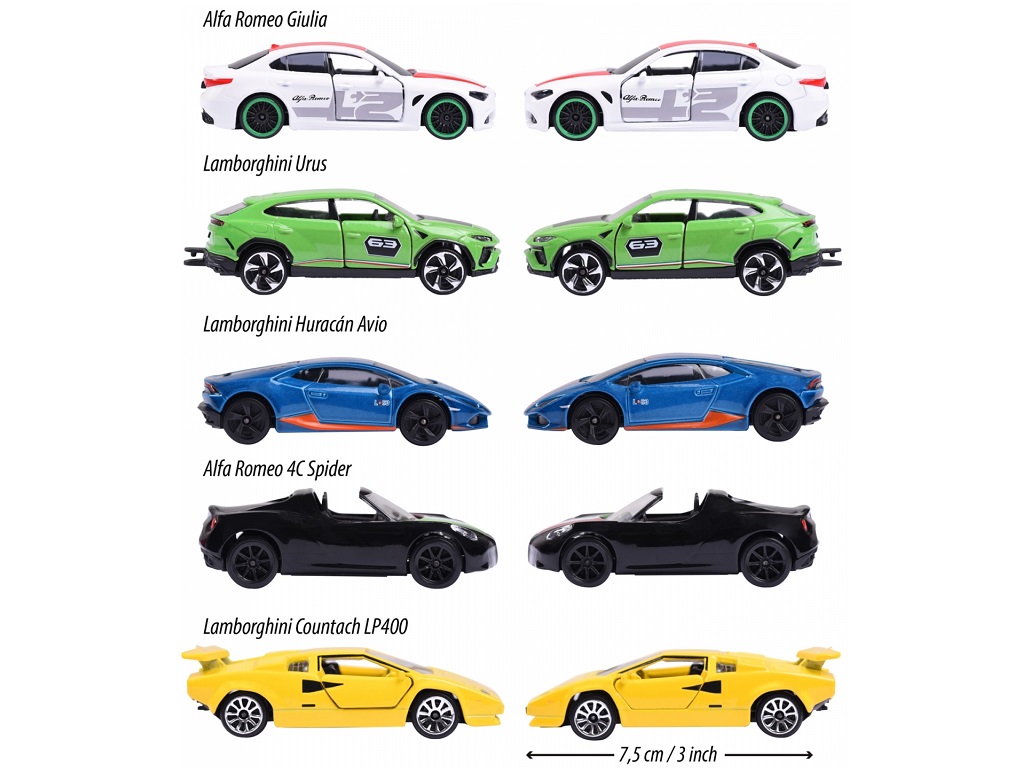 Komplet vključuje kombinacijo klasičnih in modernih modelov avtomobilov znamk Alfa Romeo in Lamborghini, ki ponujajo edinstveno mešanico elegance in zmogljivosti.