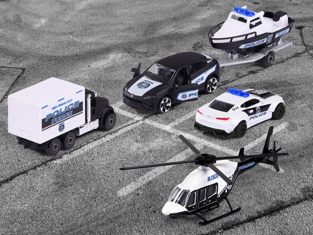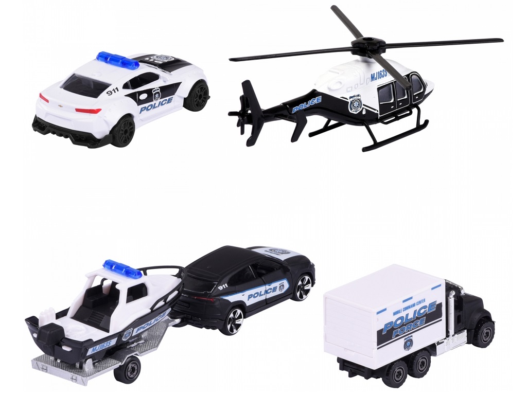 Majorette Police Force Giftpack 4 kosi – Darilni set s 4 kovinskimi vozili za otroke, stare 3 leta in več, policijski avto, policijski tovornjak, policijski helikopter in policijska prikolica s čolnom.