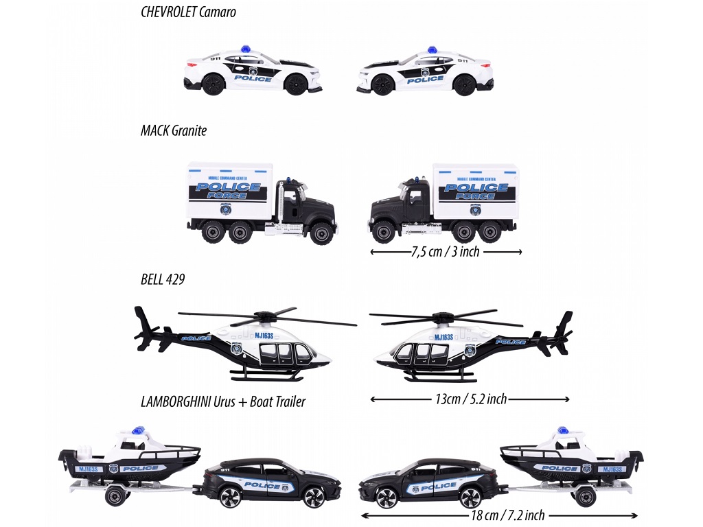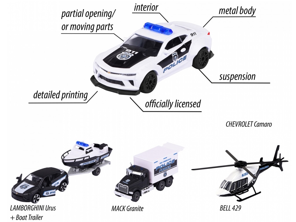Komplet vsebuje 4 vozila, ki bodo vašega malčka zagotovo zabavala. Tovornjak Mack Granit ima privlačne kromirane dele ter zadnja vrata, ki jih je mogoče odpreti in zapreti. Lamborghini Urus ima prav tako bogato zasnovo, priložena pa sta mu prikolica in čoln za vodne misije. Chevrolet ima vgrajeno vzmetenje za gladko vožnjo, helikopter Bell 429 pa ima vrtljiv propeler, tako kot v resničnem življenju!