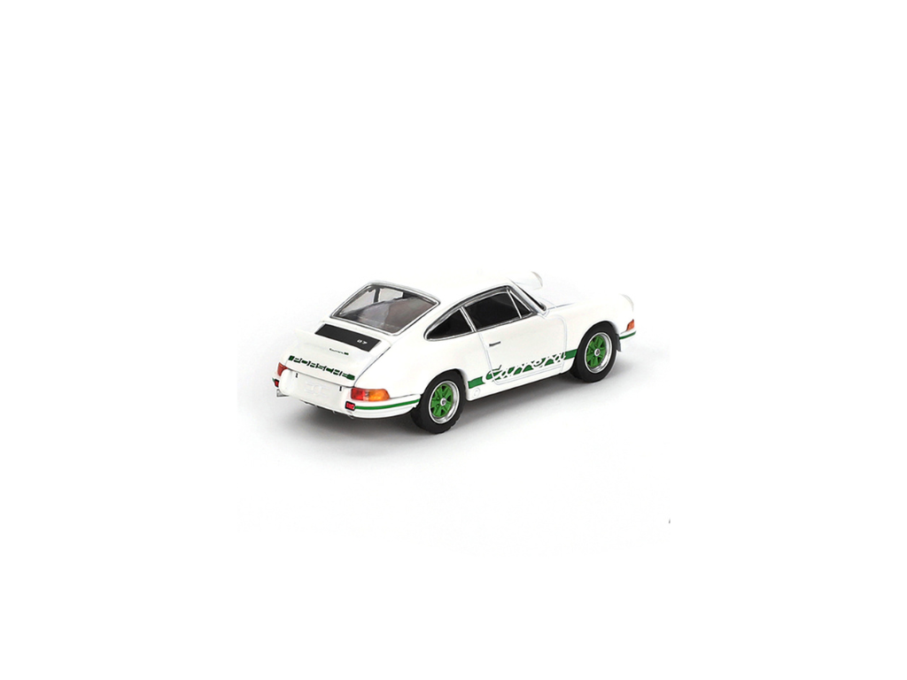 Mini GT Porsche 911 (901) je precizno izdelan zbirateljski model v merilu 1:64, ki pristno zajame duh ikonične Porsche 911 Carrera RS iz začetka 70-ih, odet v klasično barvno shemo — Grand Prix bela s kontrastnimi zelenimi detajli in platišči. Model združuje športno eleganco in nostalgično obliko legendarnega Porscheja.