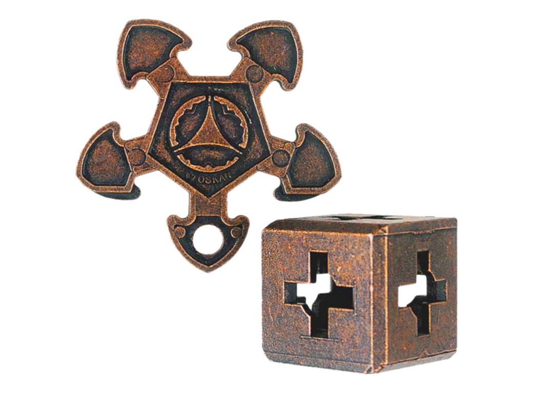 MISELNI IZZIV O’GEAR T3 je avtor zmagovalnega izziva na 1. letnem svetovnem tekmovanju v oblikovanju miselnih izzivov leta 2001 je mladi nizozemski fenomen Oscar, ki velja za enega najpametnejših ustvarjalcev na svetu. Ta miselni izziv odlikuje edinstven način sestavljanja. Ko je del pravilno vstavljen v železno kocko, lahko v svoji čudoviti končni podobi služi tudi kot namizni okras. Deluje pomirjujoče in lahko poteši še tako močno intelektualno radovednost. Ključna beseda je ‘zobje’. NOB