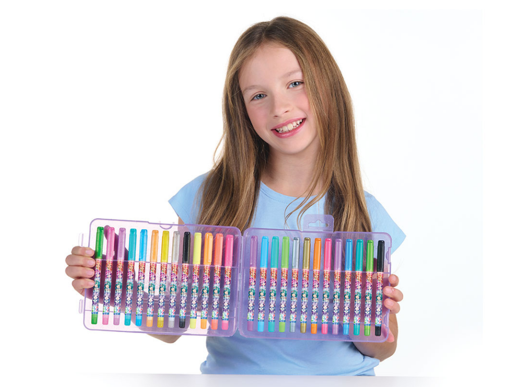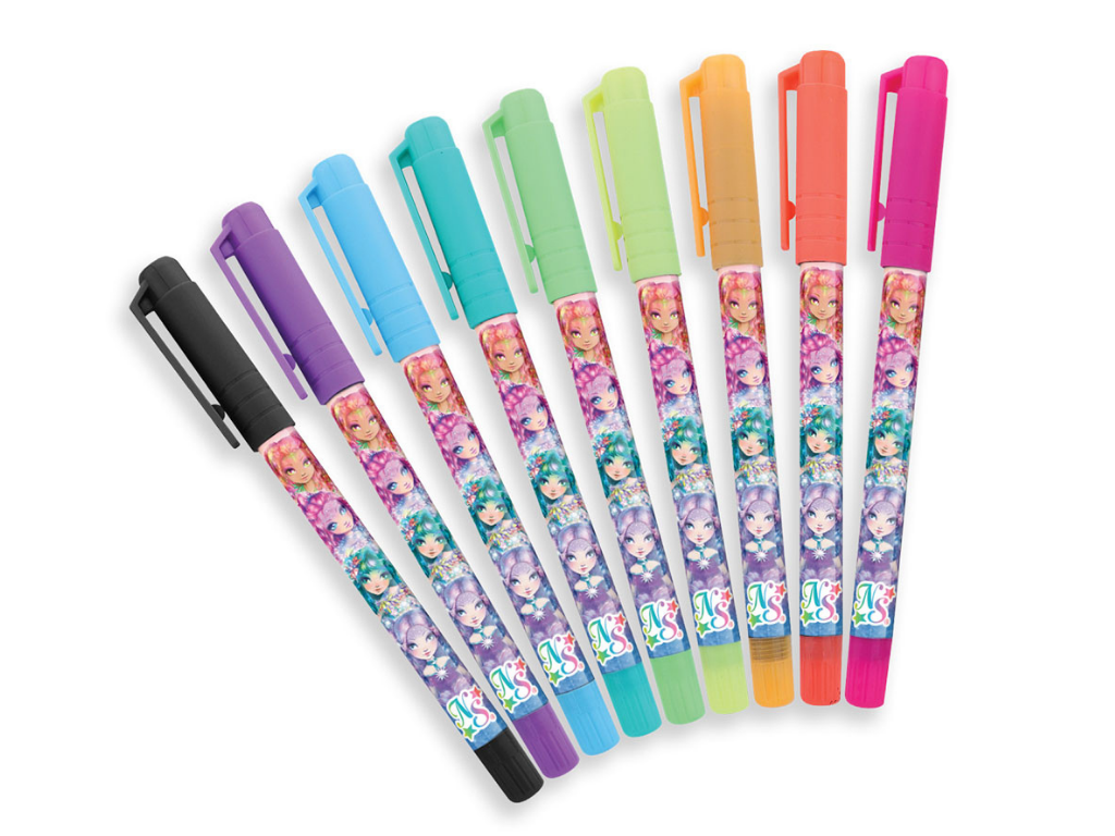 V kompletu se nahaja kar 26 gel pisal, razdeljenih na štiri kategorije: 9 bleščečih za sijoče učinke, 8 kovinskih za eleganten videz, 8 neonskih za drzne barvne poudarke in 1 črno pisalo za klasično pisanje ali obrobljanje risb. Pisala tečejo gladko po papirju, barve so intenzivne, hkrati pa se hitro sušijo, kar preprečuje packanje.
