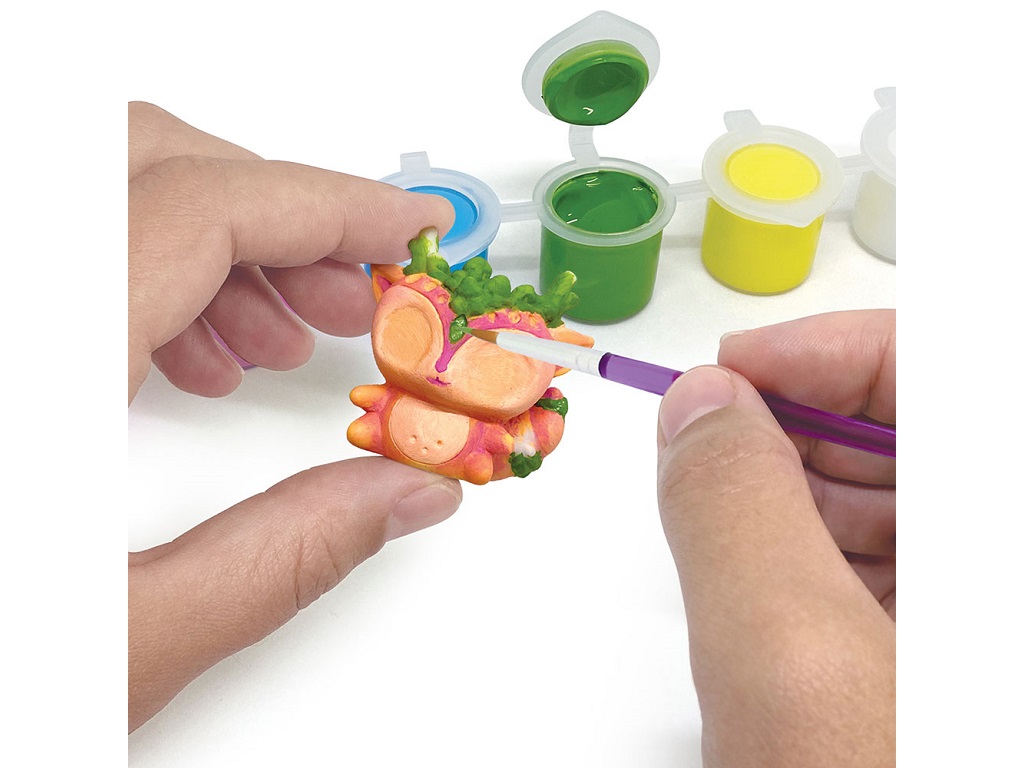 • Komplet vsebuje 3 terarije v obliki diamanta, okrasno stojalo, 3 nepobarvane figurice, 6 akrilnih barv, tubo z barvo, ki se sveti v temi, svetleči prah, čopič, glino, 9 umetnih rastlin, 6 kamnov, ki se svetijo v temi, kovinsko nitko