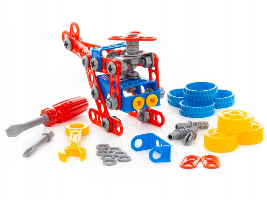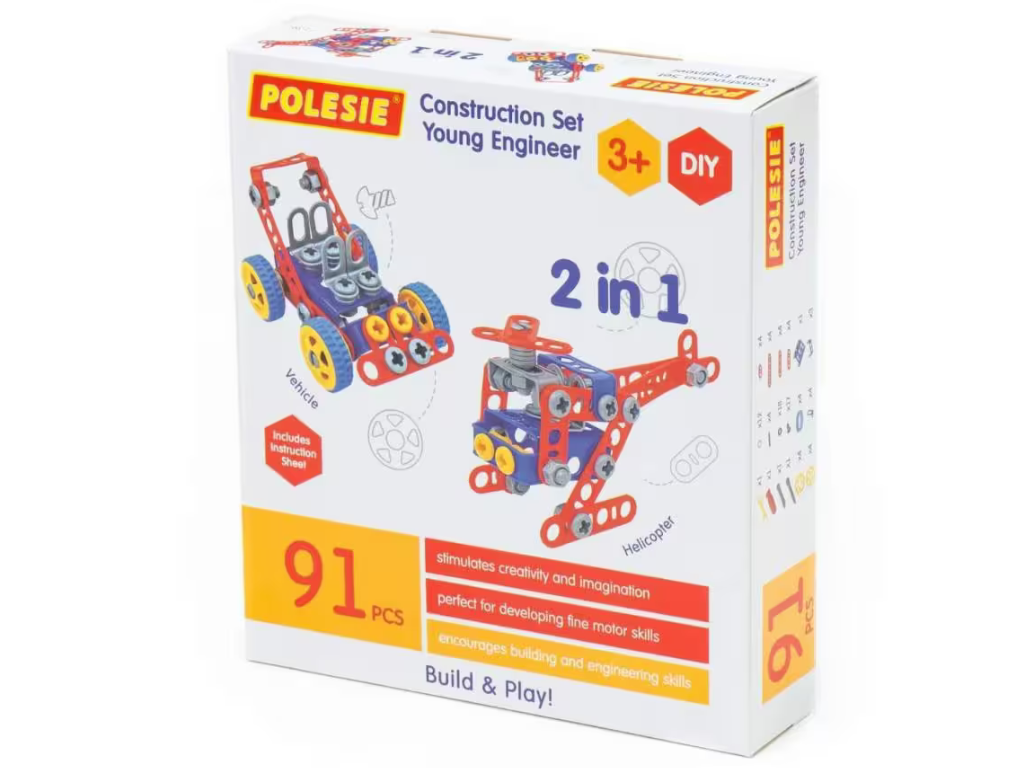 Polesie konstrukcijski set 2v1 – 91 delni je ustvarjalni komplet za male inženirje, ki želijo sami graditi in raziskovati svet mehanike. Set je namenjen otrokom od 3. leta starosti naprej. Omogoča gradnjo dveh različnih modelov – helikopterja in vozila, kar spodbuja domišljijo, ustvarjalnost in logično razmišljanje.