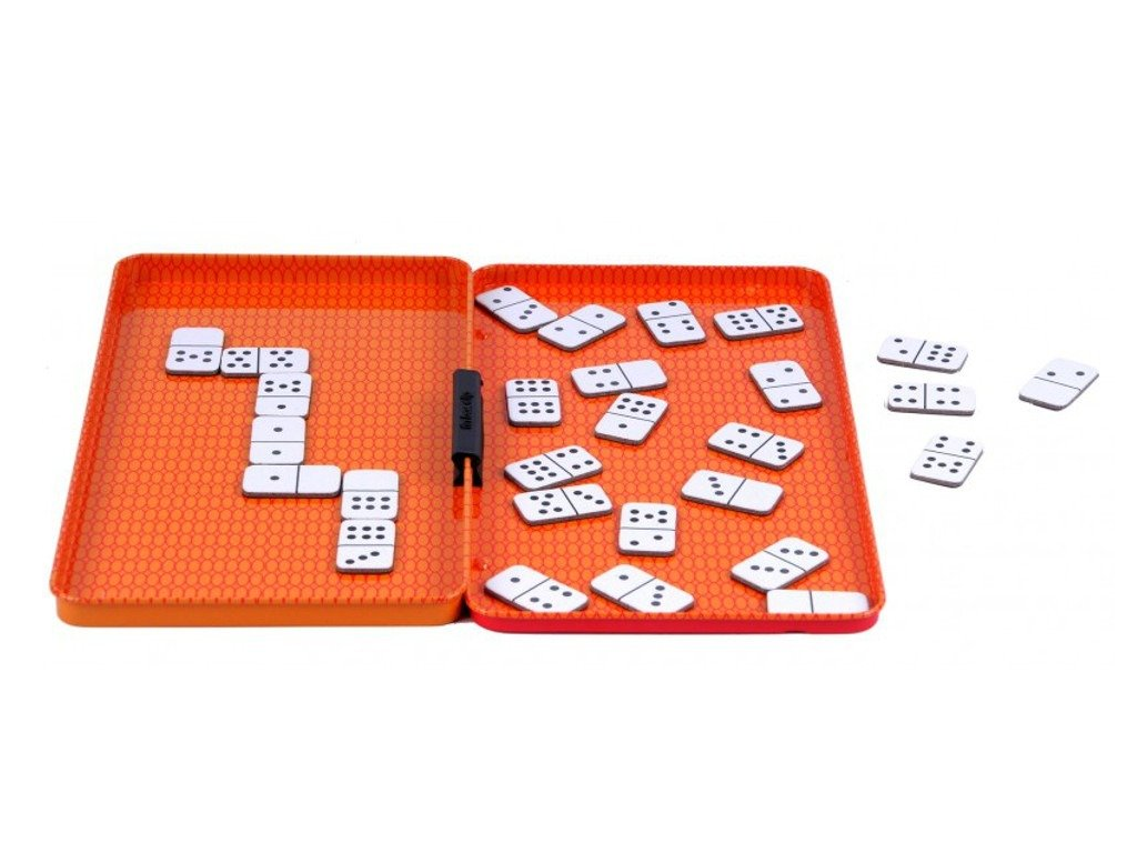 Potovalna igra Domino je priljubljena družabna igra s pravokotnimi ploščicami (dominami), razdeljenimi na dve polovici. Na vsaki polovici je od 0 do 6 pik. Igralci se morajo čim prej znebiti vseh svojih magnetnih ploščic, pri čemer jih polagajo na igralno površino le, če se število pik na njihovi ploščici ujema s številom pik na končnih ploščicah na mizi. Zmaga tisti, ki prvi ostane brez domin.