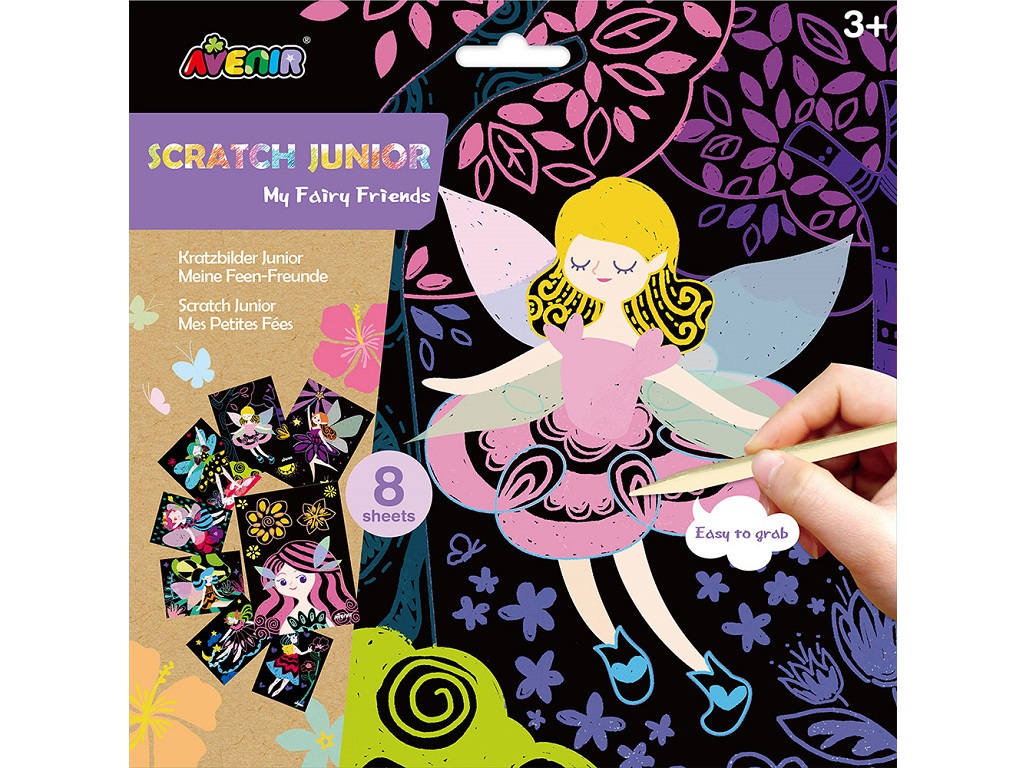 Praskanke junior 8 list. – pravljične vile so ustvarjalni komplet, posebej zasnovan za otroke starejše od treh let. Ta čarobni set spodbuja otroško domišljijo in ustvarjalnost, saj omogoča odkrivanje skritih živobarvnih slik z enostavnim praskanjem črnih listov.