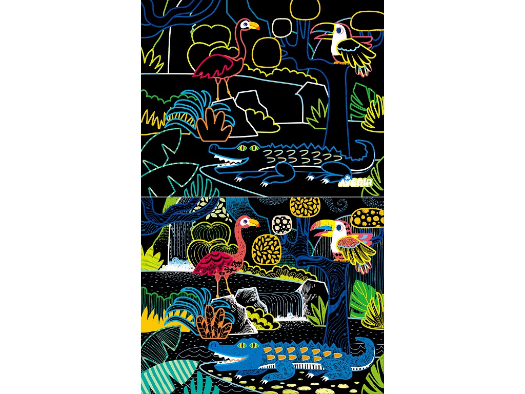 Komplet vsebuje črni papir, na katerem so skriti čudoviti vzorci in barve. S priloženim praskalom otroci lahko previdno popraskajo po površini papirja, da odkrijejo pisane motive, ki se skrivajo pod črno plastjo. Postopek praskanja je enostaven in zabaven, rezultati pa so vedno presenetljivi in čudoviti.