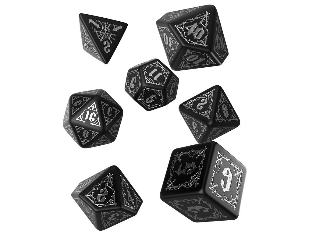 Q Workshop RPG kocke black and silver – Q Workshop, priznani proizvajalec visokokakovostnih RPG pripomočkov, vam predstavlja čudovit komplet 7 kock, oblikovan posebej za igro Dungeons and Dragons in ostale igre igranja vlog. Te impresivne kocke so zasnovane z mislijo na strastne ljubitelje igranja vlog, ki cenijo estetsko dovršene in funkcionalne igralne pripomočke.