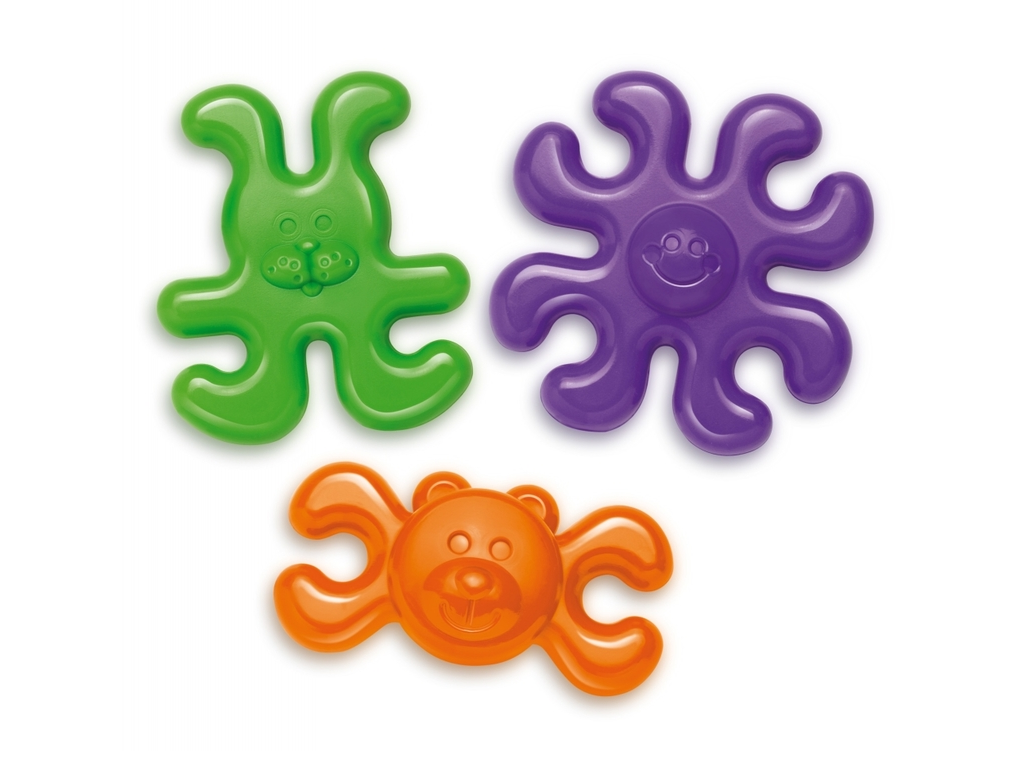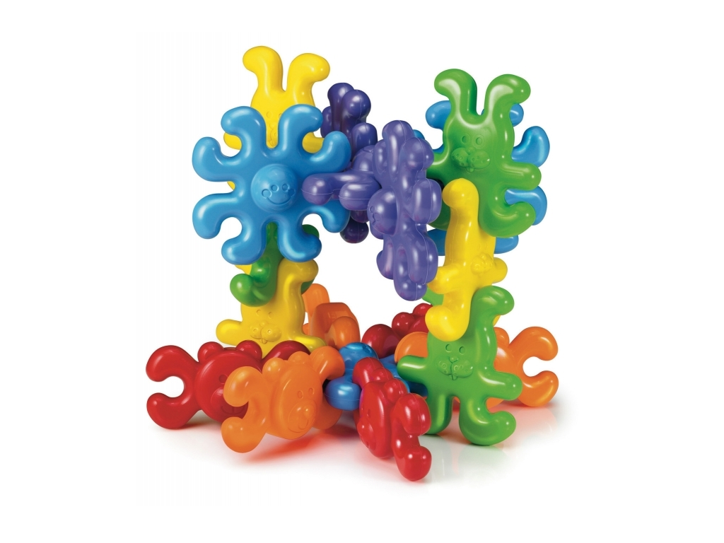 Komplet za najmlajše. Otroci barvne dele povezujejo v verige ali druge strukture, hkrati pa razvijajo fino motoriko, vizualno-gibalno koordinacijo, razlikujejo barve in oblike ter krepijo mišice v rokah.