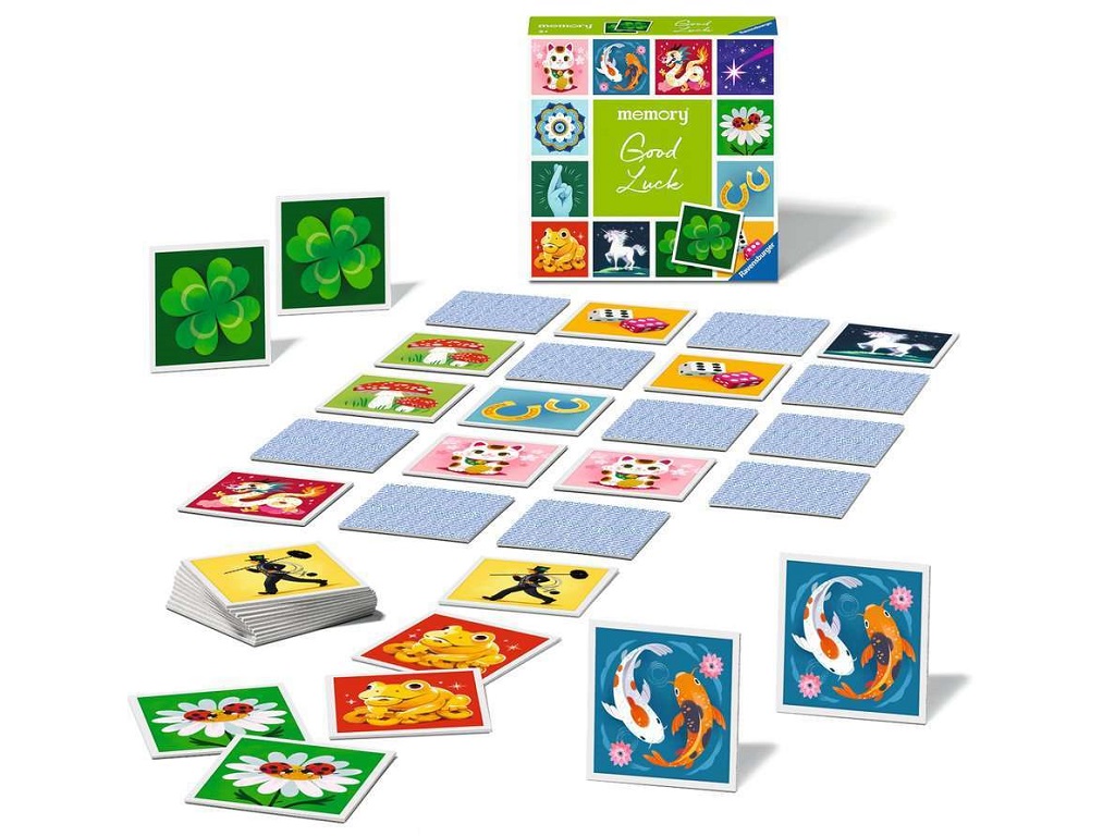 Ravensburger Memory moments – Good Luck je igriva in barvita različica klasične igre spomina, ki nosi sporočilo sreče in pozitivne energije. Na 48 čudovito ilustriranih karticah (24 parov) boste našli simbole sreče iz različnih kultur – od deteljic s štirimi listi in podkev do pikapolonic in drugih motivov, ki simbolizirajo dobro srečo po svetu.