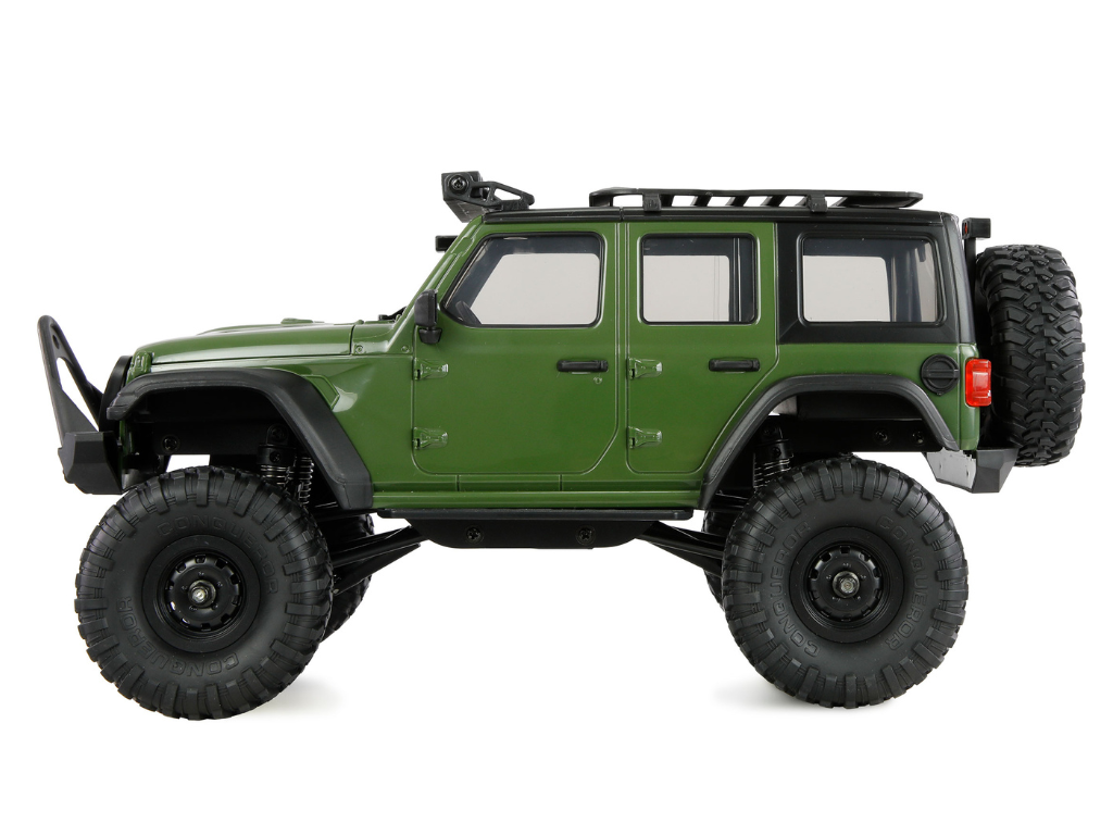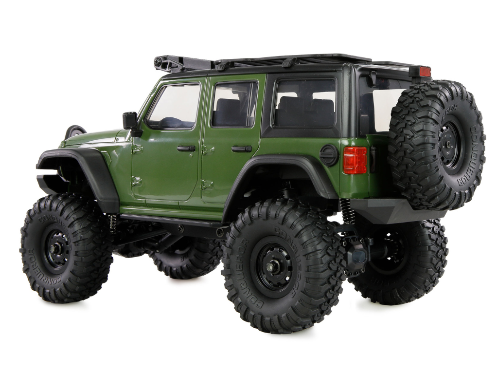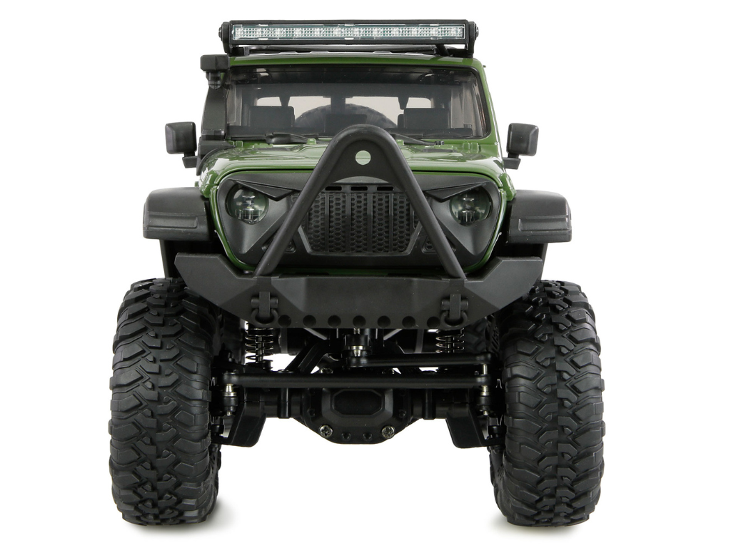 RC Crosstrail Crawler 4WD 1:16 RTR zelen je majhen, a zmogljiv terenec, ki prepriča s premišljeno tehnologijo, enostavno elektroniko in robustno konstrukcijo. Sprednje in zadnje LED-luči, ki jih aktiviraš s pritiskom na gumb, ter dodatna LED strešna letev z različnimi načini osvetlitve poskrbijo za realistično izkušnjo in vožnjo tudi v mraku. Podrobno oblikovana karoserija ima hitro sprostitev na zadnjem delu, kar omogoča preprosto menjavo baterije ali vzdrževanje šasije v enem koraku.