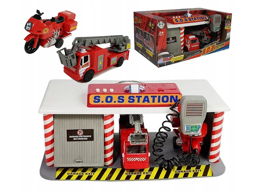 Vaš otrok se bo lahko igral kot gasilesc iz gasilske enote. Na strehi garažne hiše so trije gumbi z zvočnnimi ter svetlobnimi signali. Na desni strani garaže je priložen tudi voki-toki.