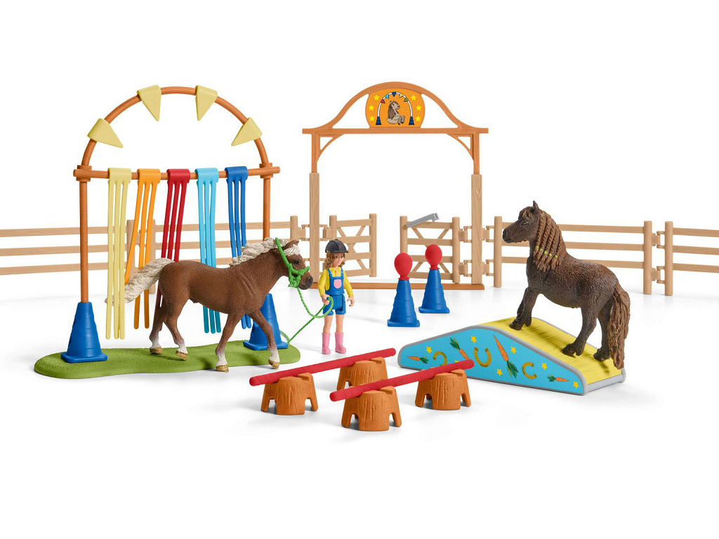 1x klasični poni, 1x shetlandski poni, 1x deklica, 1x jahalna čelada, 1x uzda, 1x vrv za vodenje, 1x vhodna vrata, 8x ograde, 1x gugalnica, 4x stožec, 4x ovire iz debla drevesa, 2x drog, 2x balon, 1x osnovna plošča, 1x lok, 4x pentlja, 1x prečnik, 5x zavesa, 1x list z nalepkami