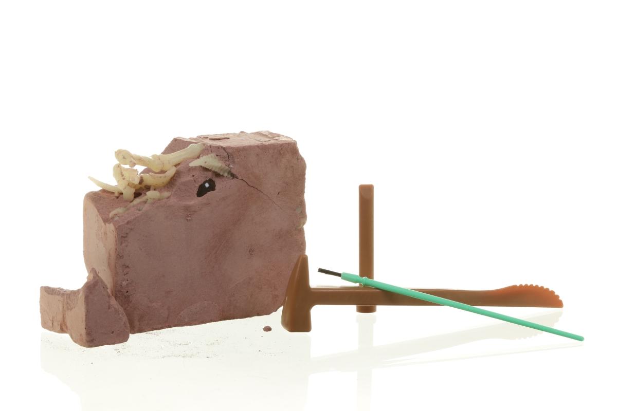 Vsebina: 1 kocka iz gipsa z nalepkami delcev DNK in kompletom okostja dinozavra, ki se sveti v temi, 1 posebej zasnovano orodje za izkopavanje, 1 čopič, 2 projekcijski podlogi (42 x 42 cm) 1 kos mehkega voska in podrobna navodila.