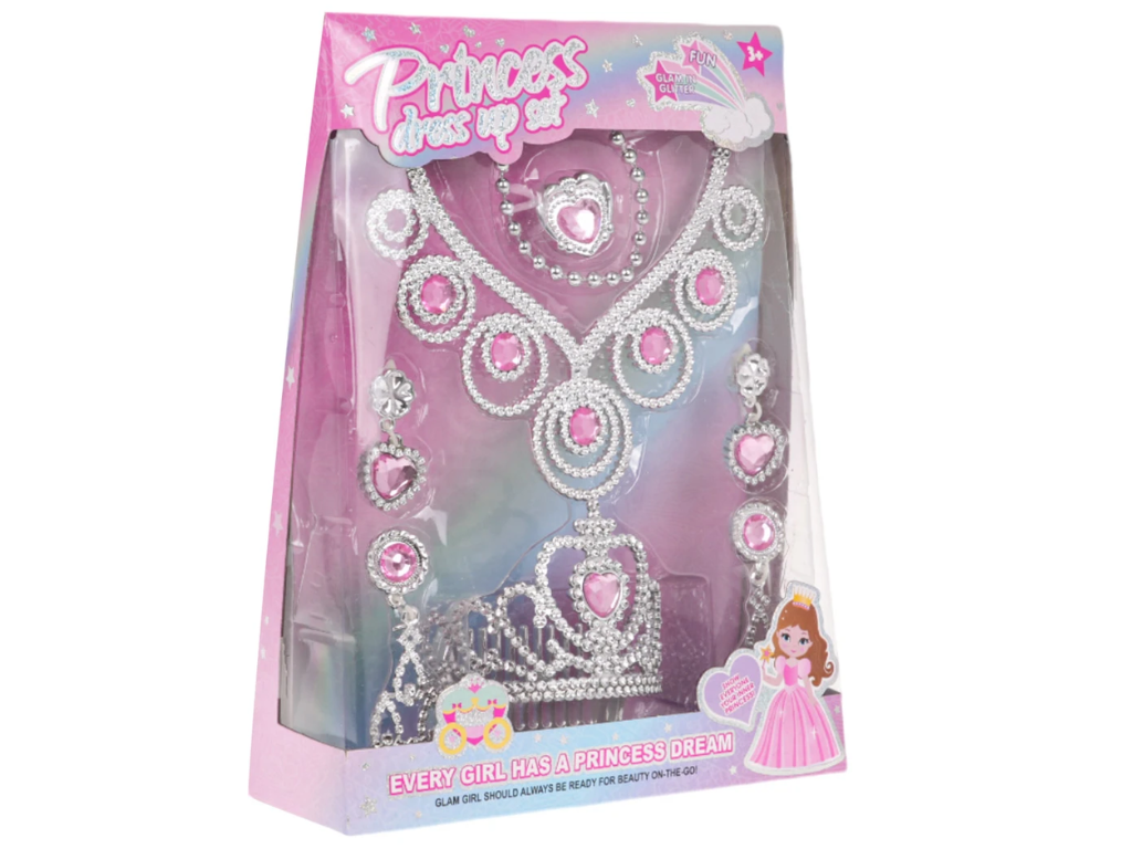 Set vključuje tiaro, ogrlico, uhane in prstan, okrašene s plastičnimi diamanti in imitacijami dragih kamnov v nežnih roza in srebrnih odtenkih. Bleščeči detajli ustvarjajo eleganten videz, ki dopolni vsako princeskino obleko. Vsi elementi so prilagojeni otrokom in zasnovani tako, da so varni ter udobni za nošenje.
